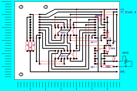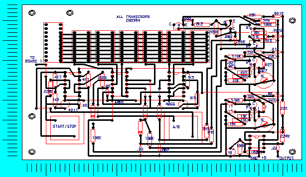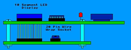 The boards are connected using a 20 pin wire-wrap ic socket. The switches are also in wire-wrap sockets but cut shorter to make the pulse buss.